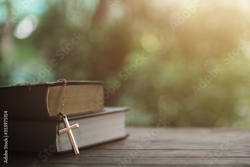 Obraz premium Bible book put on wood desk table old vintage for background.