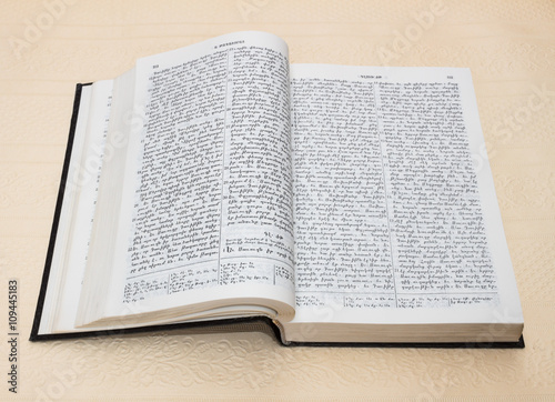 © Kiroveg, Fototapeta premium Bible is an open book with text on white paper background on the beige-pink color