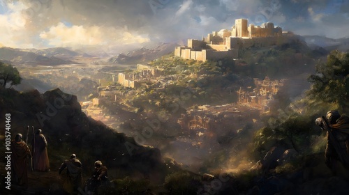 Fototapeta premium Biblical Depiction of a Massive Fortified City on a Hill, Zion Under Siege,...