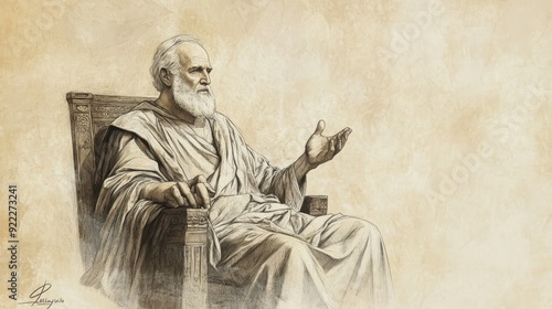 Fototapeta premium Biblical Illustration: An elderly King David sitting on his throne, speaking his final words to his gathered sons, set against a beige background for Bible wall art.