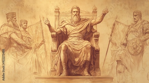 © T Studio, Fototapeta premium Biblical Illustration: David, accepting tributes from defeated kings, sits on a throne with banners of conquered nations displayed around him, set against a beige background for Bible wall art.
