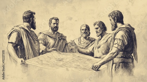© T Studio, Fototapeta premium Biblical Illustration: David, standing over a map with his commanders, planning the next move after a decisive victory against the Syrians, set against a beige background for Bible wall art.