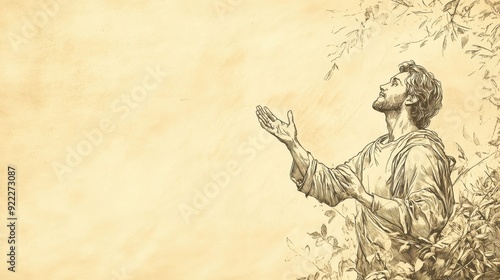 © T Studio, Fototapeta premium Biblical Illustration: David surrounded by nature, expressing gratitude for God saving him from his enemies, set against a beige background for Bible wall art.