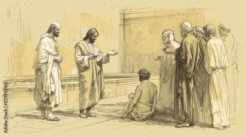 Fototapeta premium Biblical Illustration: Healing at Bethesda, Jesus and Invalid, Onlookers Question, Beige Background, Copyspace