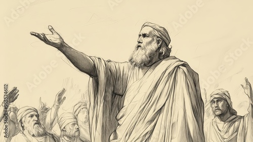 Fototapeta premium Biblical Illustration: Moses addressing the Israelites, emphasizing the importance of renewing their covenant with God. Deuteronomy scene, beige background, ideal for Bible wall art.