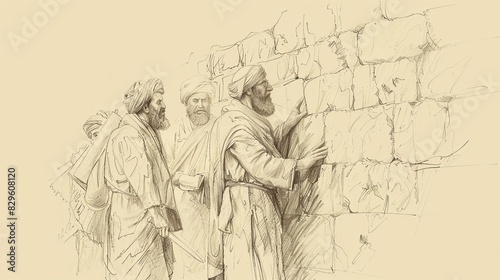 © T Studio, Fototapeta premium Biblical Illustration: Nehemiah Rebuilds the Wall, Leading Effort with Determination, Facing Opposition, Beige Background, Copyspace