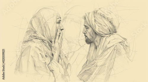 © T Studio, Obraz premium Biblical Illustration of Annunciation of John the Baptist’s Birth, Zechariah Struck Mute, Beige Background, Copyspace