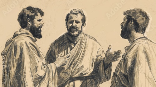 Fototapeta premium Biblical Illustration of Apostle James the Greater Preaching in Spain, Spreading Gospel Far and Wide on Beige Background with Copyspace