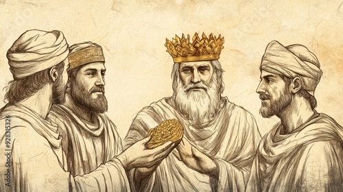 Fototapeta premium Biblical illustration of elder David presenting a golden crown to Solomon, with his other sons watching, highlighting the moment of royal succession and leadership in a solemn beige background