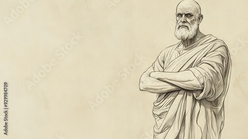 Fototapeta premium Biblical Illustration of Eliphaz Speaking with Authority - Eliphaz Standing with Arms Crossed, Questioning Job’s Righteousness, Beige Background