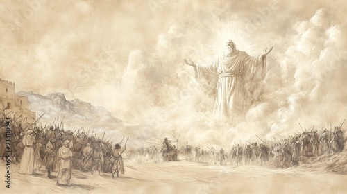 Obraz premium Biblical Illustration of God Leading His People into Battle, a Towering...