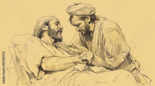 © T Studio, Fototapeta premium Biblical Illustration of Good Samaritan Tending to Injured Man on Roadside, Beige Background, Copyspace