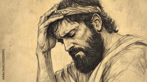 © T Studio, Fototapeta premium Biblical Illustration of Jehoram Reflecting on His Life and Choices in 2 Chronicles, Weak and Suffering, Realizing Too Late the Cost of His Actions, Beige Background