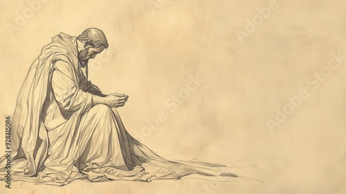 © T Studio, Fototapeta premium Biblical Illustration of Jehoshaphat Kneeling in Prayer in 2 Chronicles, Seeking Wisdom and Guidance for Leading Judah in Peace and Prosperity, Beige Background