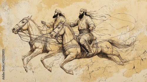 © T Studio, Obraz premium Biblical Illustration of Jehu Anointed King of Israel: Jehu Riding Furiously in His Chariot Towards Jezreel to Confront King Joram and Queen Jezebel, Beige Background