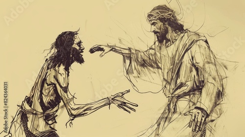 Obraz premium Biblical Illustration of Jesus Casting Out Demons from a Man in Gadara, Ideal for article