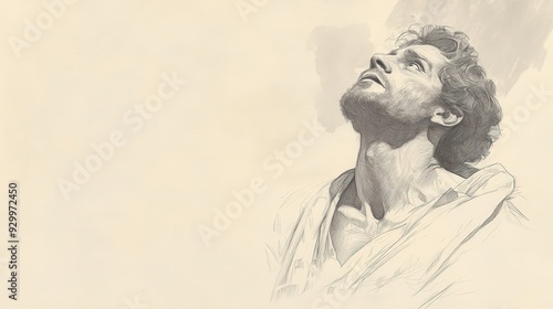Fototapeta premium Biblical Illustration of Job’s Emotional Plea to Heaven - Job Gazing Upward, Demanding an Explanation from God with Trembling Voice, Beige Background