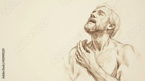 Fototapeta premium Biblical Illustration of Job’s Painful Reply - Job with a Pained Expression, Holding His Chest as He Speaks of the Agony He Feels Physically and Spiritually, Beige Background