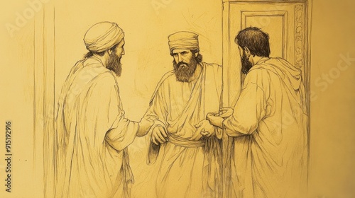 Naklejka premium Biblical Illustration of Judges: Micah’s Idols, Levite Accepting Micah’s Offer, Becoming His Priest and Serving at Household Shrine, Bible Wall Art on Beige Background