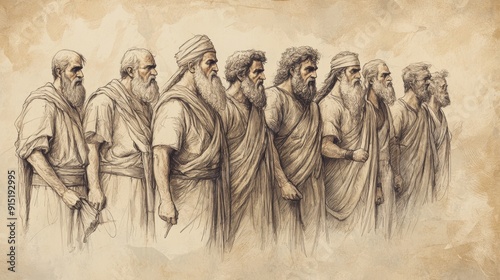 © T Studio, Fototapeta premium Biblical Illustration of Judges: Return of Benjaminites, Fathers and Brothers of Shiloh Women Protesting Abduction to Israelites, Bible Wall Art on Beige Background