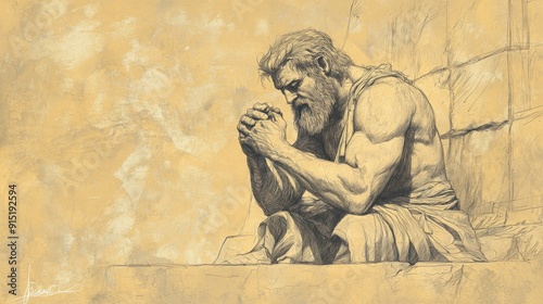 © T Studio, Fototapeta premium Biblical Illustration of Judges: Samson and Delilah, Samson Praying to Lord for Strength One Last Time in Philistine Temple, Bible Wall Art on Beige Background