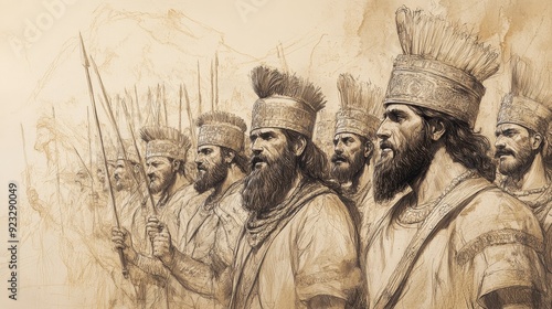 Fototapeta premium Biblical Illustration of 2 Kings: Allied Kings Witnessing Moabite King’s Sacrifice, Stirring Indignation Among Troops, Bible Wall Art with Beige Background