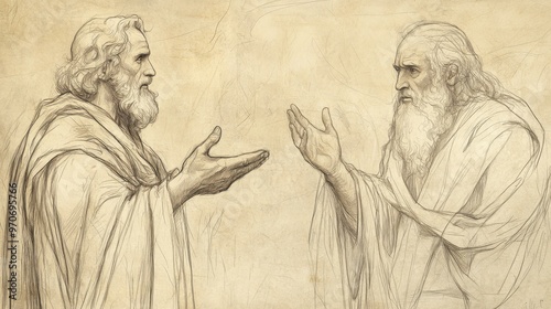 Fototapeta premium Biblical Illustration of 2 Kings: Elijah Prophesying Disaster for Jehoram’s House Due to His Sins, Bible Wall Art with Beige Background for Spiritual Warning