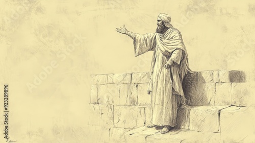 Fototapeta premium Biblical Illustration of 2 Kings: Naaman Pledges to Worship God of Israel, Asks for Earth to Build Altar at Home, Bible Wall Art with Beige Background