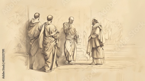 © T Studio, Fototapeta premium Biblical Illustration of Luke 1: Announcement of John and Jesus, Mary and Elizabeth Meeting, Songs of Mary and Zechariah, Beige Background, Copyspace