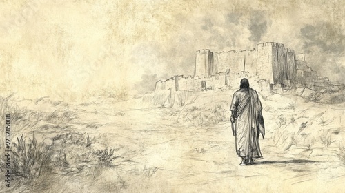 Fototapeta premium Biblical Illustration of Naboth Firmly Refusing Ahab’s Offer, Citing His Inheritance, Bible Wall Art, Beige Background