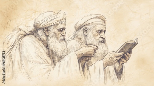 Fototapeta premium Biblical Illustration of Numbers: Elders Reciting the Story of the Exodus During Passover, Captured on a Beige Background, Emphasizing Tradition and Storytelling in Religious Observance