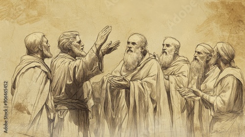 Fototapeta premium Biblical Illustration of Numbers: Moses Blessing the Levites After the Dedication Rites, Captured on a Beige Background, Emphasizing Religious Blessings and Spiritual Leadership