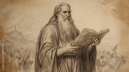 Fototapeta premium Biblical Illustration of Numbers: Moses Setting Up a New Covenant After the Rebellion, Captured on a Beige Background, Emphasizing Leadership and Renewal