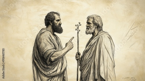 Fototapeta premium Biblical Illustration of Numbers: Moses Showing the Budded Staff to a Skeptical Tribal Leader, Captured on a Beige Background, Emphasizing Faith and Conviction