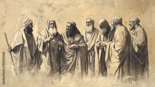 © T Studio, Fototapeta premium Biblical Illustration of Rehoboam and Elders of Jerusalem Gathering After Shishak’s Attack in 2 Chronicles, Seeking Guidance on How to Rebuild and Recover, Beige Background