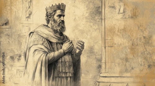 © T Studio, Fototapeta premium Biblical Illustration of Rehoboam’s Folly in 2 Chronicles, Rehoboam Alone in Throne Room, Realizing His Mistake Too Late, Facing the Consequences, Beige Background
