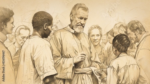 Fototapeta premium Biblical Illustration of Saint Vincent de Paul caring for the poor and sick,...