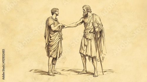 Fototapeta premium Biblical Illustration of 1 Samuel: David and Goliath, Saul Reluctantly Agrees to Let David Fight Goliath, Offers Armor, David Declines