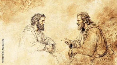 © T Studio, Fototapeta premium Biblical Illustration of 1 Samuel: Saul’s Unlawful Sacrifice, Saul and Jonathan Discussing Next Steps, Jonathan Seeking the Lord's Guidance