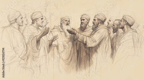 © T Studio, Naklejka premium Biblical Illustration of Saul Anointed King: Samuel Presents Saul to People, Proclaims Him King, Crowd Reacts in Awe, Beige Background, Faith, Leadership, Old Testament
