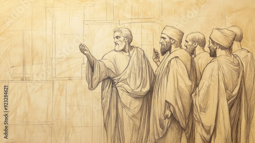 Fototapeta premium Biblical Illustration of Solomon Inspecting the Progress of Temple Construction, Surrounded by His Advisors, Bible Wall Art, Beige Background