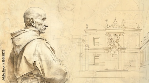© T Studio, Fototapeta premium Biblical Illustration of St. Camillus de Lellis Serving the Sick in 16th-Century Italian Hospital, Beige Background, Copyspace