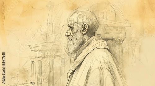 Fototapeta premium Biblical Illustration of St. Polycarp of Smyrna in Martyrdom in 2nd-Century Church, Beige Background, Copyspace