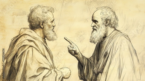 Fototapeta premium Biblical Illustration of The Lord Calls Samuel: Eli Realizing the Lord Is Calling Samuel, Instructing Samuel on How to Respond, Beige Background, Faith, Guidance, Old Testament