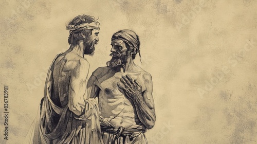 Fototapeta premium Biblical Illustration of the Parable of the Pharisee and the Tax Collector: Contrasting Prayers, Beige Background, Copyspace