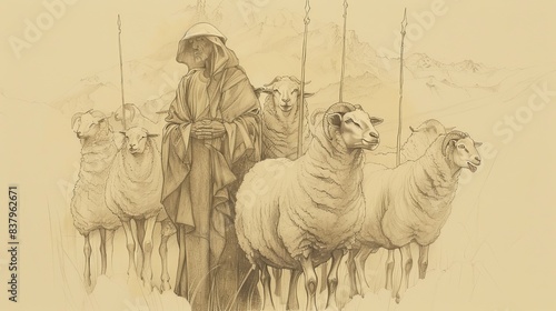 Obraz premium Biblical Illustration of the Parable of the Sheep and the Goats: Righteous Inheriting the Kingdom, Beige Background, Copyspace