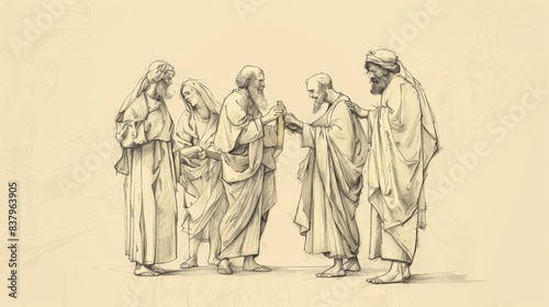 © T Studio, Fototapeta premium Biblical Illustration of the Parable of the Talents, Master Entrusting Money on Beige Background with Copyspace