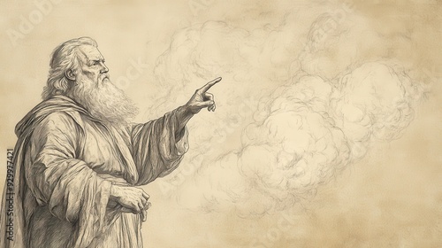 © T Studio, Fototapeta premium Biblical Illustration of Zophar’s Second Speech - Zophar Pointing Toward the Earth, Speaking of the Fleeting Nature of the Wicked’s Wealth, Beige Background