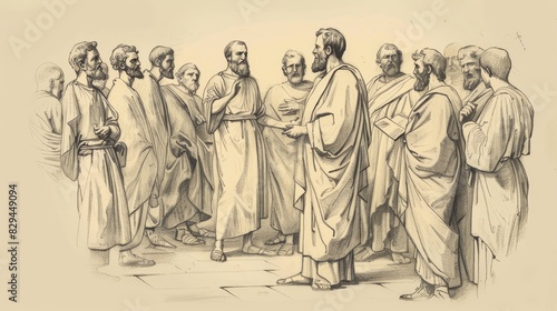 Fototapeta premium Biblical Illustration: Paul Preaches in Athens, Areopagus Sermon, Philosophers Listening, Beige Background, Copyspace