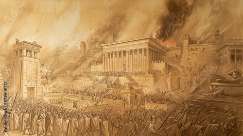 Obraz premium Biblical Illustration: The Fall of Jerusalem, Babylonians Conquer, Temple Burning, Exile Begins, Beige Background, Copyspace